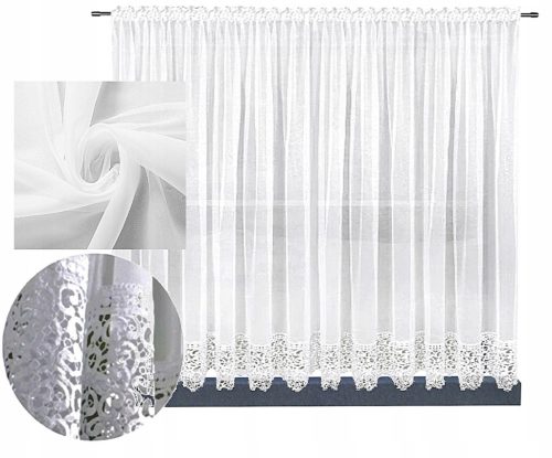 Firana została uszyta ze śnieżnobiałego woalu u góry firany została wszyta taśma marszcząca wraz z tunelem która umożliwia ładne zmarszczenie firany i dopasowanie jej do szerokości karnisza . Firanę można zawiesić na żabkach , haczykach bądź na karniszu rurkowym (TUNEL ) . Dół firany został obszyty szeroką gipiurą . Szerokość firany przed zmarszczeniem to 300 cm .