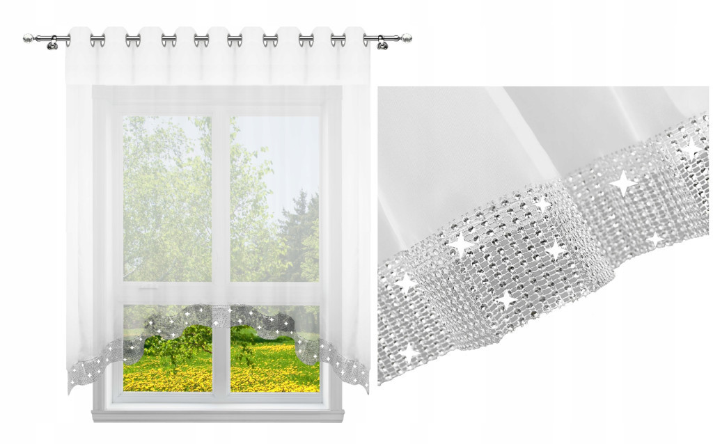 Taśma z cyrkoniami wszyta na całej długości dołu firany. Szerokość taśmy 6 cm. Dodatkowo Firana uszyta na pięknych chromowanych przelotkach dodając efektu . Na pozostałych aukcjach firany w różnych wymiarach.