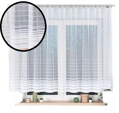 Firana wykonana z białego żakardu,zdobiona na dole pasami o różnej szerokości.