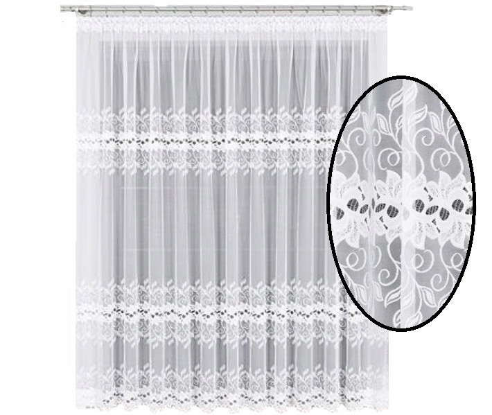 Firana gotowa do zawieszenia. Posiada wszytą taśmę marszczącą oraz obszyte boki.