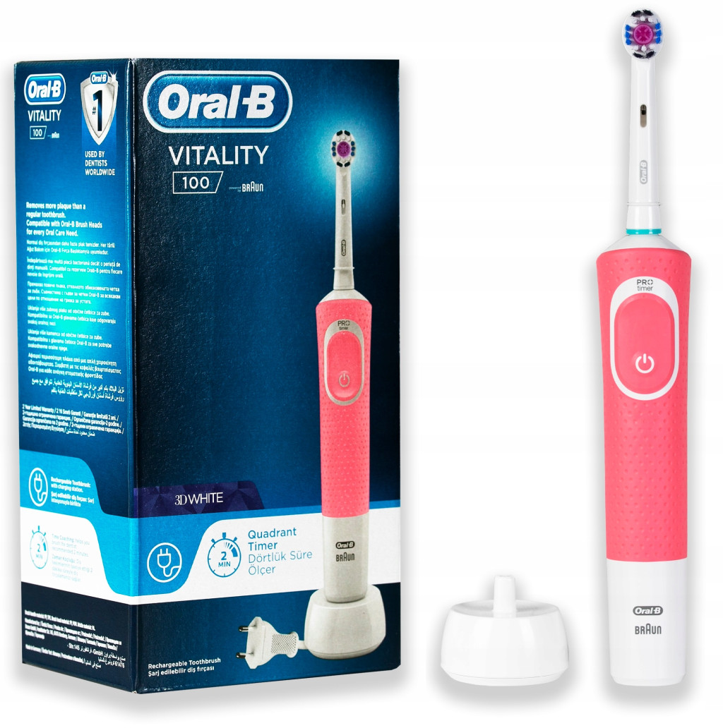 to nowoczesna i designerska szczoteczka elektryczna do zębów. Braun Oral-B Vitality 100 zapewnia wysoką jakość czyszczenia zębów dzięki zastosowanej technologi 2D Action, tj. ruchów oscylacyjno-rotacyjnych. Mechanizm szczoteczki elektrycznej Oral B Vitality wykonuje 7.600 ruchów osyclacyjno-rotacyjnych dzięki czemu dokładnie oczyszcza zęby usuwając więcej płytki nazębnej w porównaniu ze szczoteczką manualną. Jednostajny ruch główki szczoteczki Oral-B Vitality 100 o wysokim natężeniu doskonale poleruje szkliwo usuwając płytkę nazębną, osady oraz uporczywe przebarwienia. Regularne szczotkowanie zębów szczoteczką elektryczną Oral-B Vitality 100 przywraca zębów naturalną biel oraz zmniejsza ryzyko powstawania stanów zapalanych dziąseł.