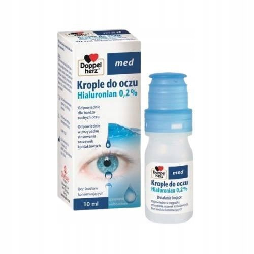 Połączenie hialuronianu sodu z hypromelozą zapewnia intensywne i długotrwałe nawilżenie powierzchni oka. Doppelherz med Krople do oczu Hialuronian 0,2% to sterylny roztwór do oczu zawierający połączenie dwóch substancji nawilżających: hialuronian sodu i hypromelozę, z bogatą kompozycją składników pochodzenia roślinnego: woda destylowana z rumianku, aloesu, borówki czarnej i dzikiej róży. Doppelherz med Krople do oczu Hialuronian 0,2% jest roztworem sterylnym i nie zawiera środków konserwujących ani buforów fosforanowych, dzięki czemu może być stosowany bezpośrednio na soczewki kontaktowe.