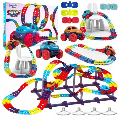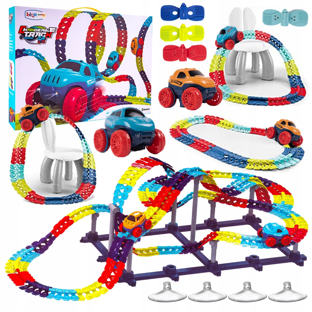 Tor składa się z pojedynczy elementów, które łączy się się ze sobą system na klik. Podczas składania elementów możesz stworzyć tor o dowolnej kolorystyce, a trasę przejazdu ustalasz dowolnie po złożeniu wszystkich elementów. Tor możesz oczywiście wydłużać i powiększać, dokupując kolejne zestawy.