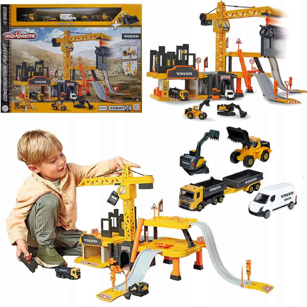 Zestaw budowlany, przedstawia dźwig z opuszczanym hakiem i rampy, po których mogą poruszać się pojazdy. Wraz z placem budowy w zestawie znajduje się 5 różnych pojazdów marki Volvo, które pomogą w dokończeniu budowy.