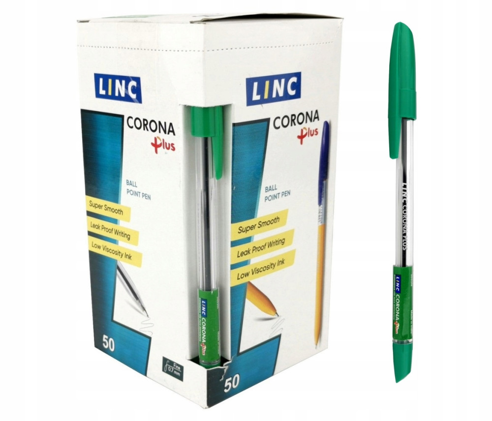 Zestaw 50szt długopisów z wymiennym wkładem. Transparentna obudowa daje możliwość bieżącego kontrolowania poziomu zużycia tuszu. Wyposażony w wentylowaną skuwkę z klipem. Jest to akcesorium, którego nie może zabraknąć w szkolnym piórniku czy na firmowym biurku. - kolor zielony