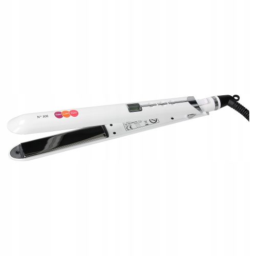 Obrotowy (360°) przewód o długości 2,7m Pełne nagrzanie w 30 sekund Wymiary płytek: 24 x 110mm Chłodna końcówka Wyświetlacz temperatury (LCD) Przyciski regulacji temperatury +/- Przycisk ON/OFF Blokada prostownicy Napięcie: 220-240VAC 50/60 Hz Moc: 40W