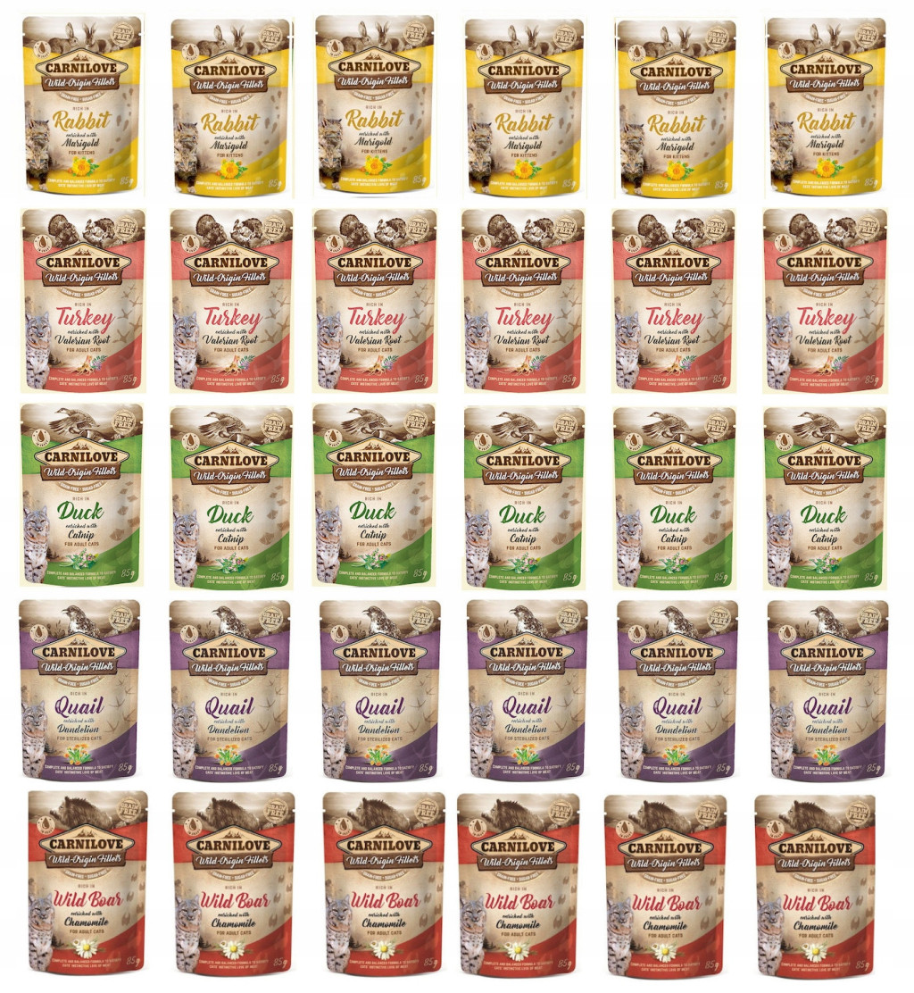 CARNILOVE CAT POUCH 85 g pełnowartościowa, bezzbożowa karma dla kotów dorosłych w 5 smakach. Zestaw zawiera 30 saszetek po 6 sztuk ze smaku.