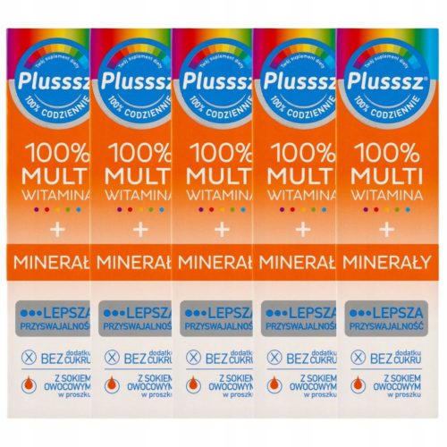 Plusssz 100% Multiwitamina + Minerały to suplement diety o smaku mango-pomarańcza, zawierający kompleks 10 najważniejszych witamin oraz minerały, takie jak magnez, cynk, selen, wapń i miedź. Produkt przeznaczony jest dla osób dorosłych, które chcą wspierać swoją odporność, układ nerwowy oraz ogólne zdrowie.