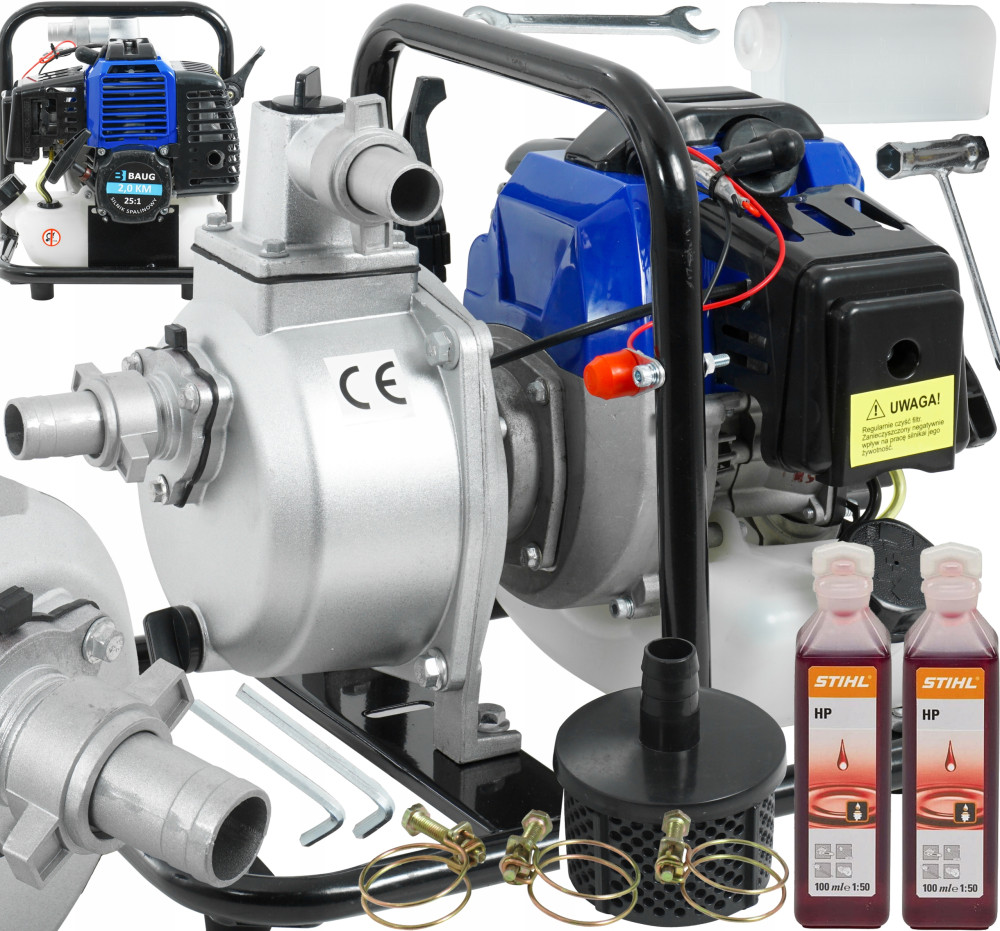 Wydajna pompa spalinowa marki Baug została zabudowana w stalowej ramie chroniącej ją przed uszkodzeniem, oraz ułatwiającej transport. Świetnie sprawdza się przy nawadnianiu, w czasie suszy i przy wszelkich pracach wymagających przepompowania wody. Wyposażona została w mocny silnik dwusuwowy o mocy 2KM.