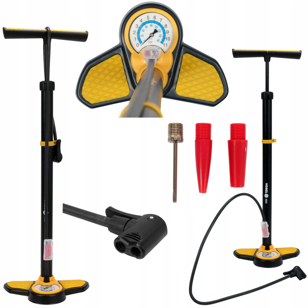 Pompka z manometrem wyposażona w uniwersalną podwójną głowicę.