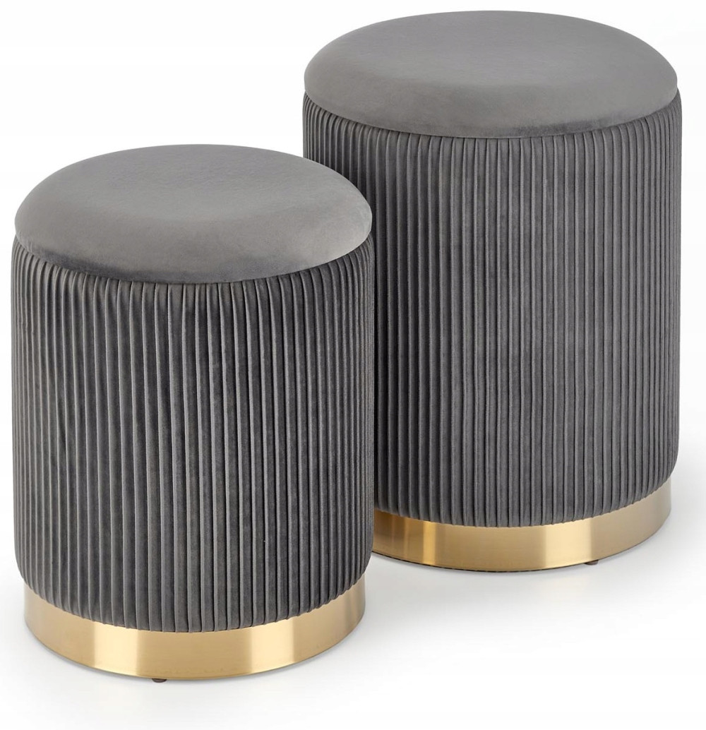 Prezentowany zestaw puf to znakomite rozwiązanie do salonu lub sypialni. Pufy tapicerowane są miękką i przyjemną w dotyku - tkaniną welurową. Uzupełnieniem są natomiast podstawy ze stali chromowanej w wybarwieniu złotym. Ponadto we wnętrzu puf znajdziemy pojemne schowki na przedmioty codziennego użytku. Niewątpliwie zaletą zestawu jest możliwość schowania mniejszej pufy do większej, dzięki czemu zaoszczędzimy miejsce w pokoju.