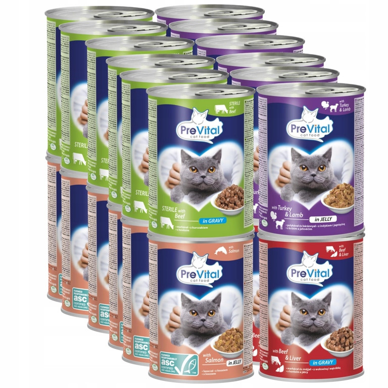 Produkty PreVital dostępne są zarówno w formie aromatycznej karmy suchej i przekąsek, jak i w formie karmy mokrej - kawałki w sosie lub galaretce w puszkach, puszyste musy w małych puszkach typu dania na jeden raz oraz delikatne fileciki zamknięte w wygodnej saszetce.