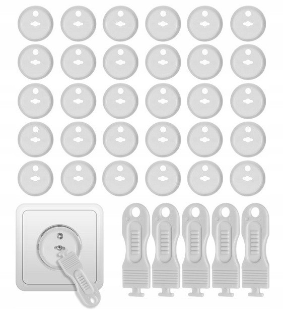 ZABEZPIECZENIE PRZED DZIEĆMI NA GNIAZDKO ELEKTRYCZNE Z BOLCEM UZIEMIAJĄCYM ORAZ ZWYKŁYCH BEZ BOLCA (30 SZT). + 5 KLUCZYKÓW.