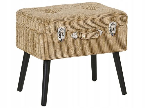 Zainspirowany stylem vintage tapicerowany sztruksem stołek w beżowym kolorze udekorowany jest ozdobnymi guzikami, błyszczącymi srebrnymi klamrami i stylowym uchwytem. Siedzisko przypominające walizkę można otworzyć, a w jego wnętrzu znajdzie się miejsce na wszelkie drobiazgi. Smukłe, eleganckie nóżki podkreślają klasyczny wygląd stołka.