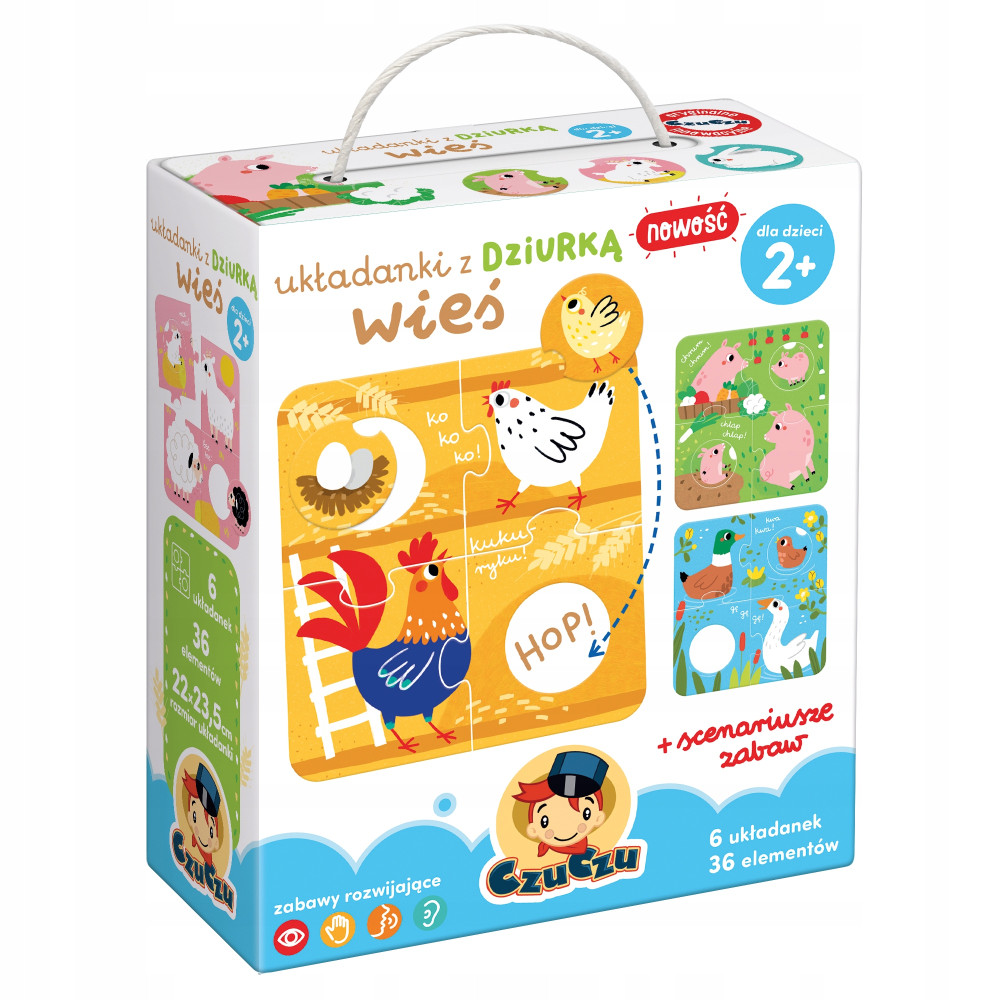 Dwulatek jest uważnym obserwatorem otaczającego go świata. Codziennie poznaje nowe słowa i staje się coraz bardziej samodzielny. Układanki z dziurką Wieś pozwalają rozwijać małą i dużą motorykę, spostrzegawczość i wyobraźnię. Inspirują do rozmów o zwierzętach i poznawania nowych słów.