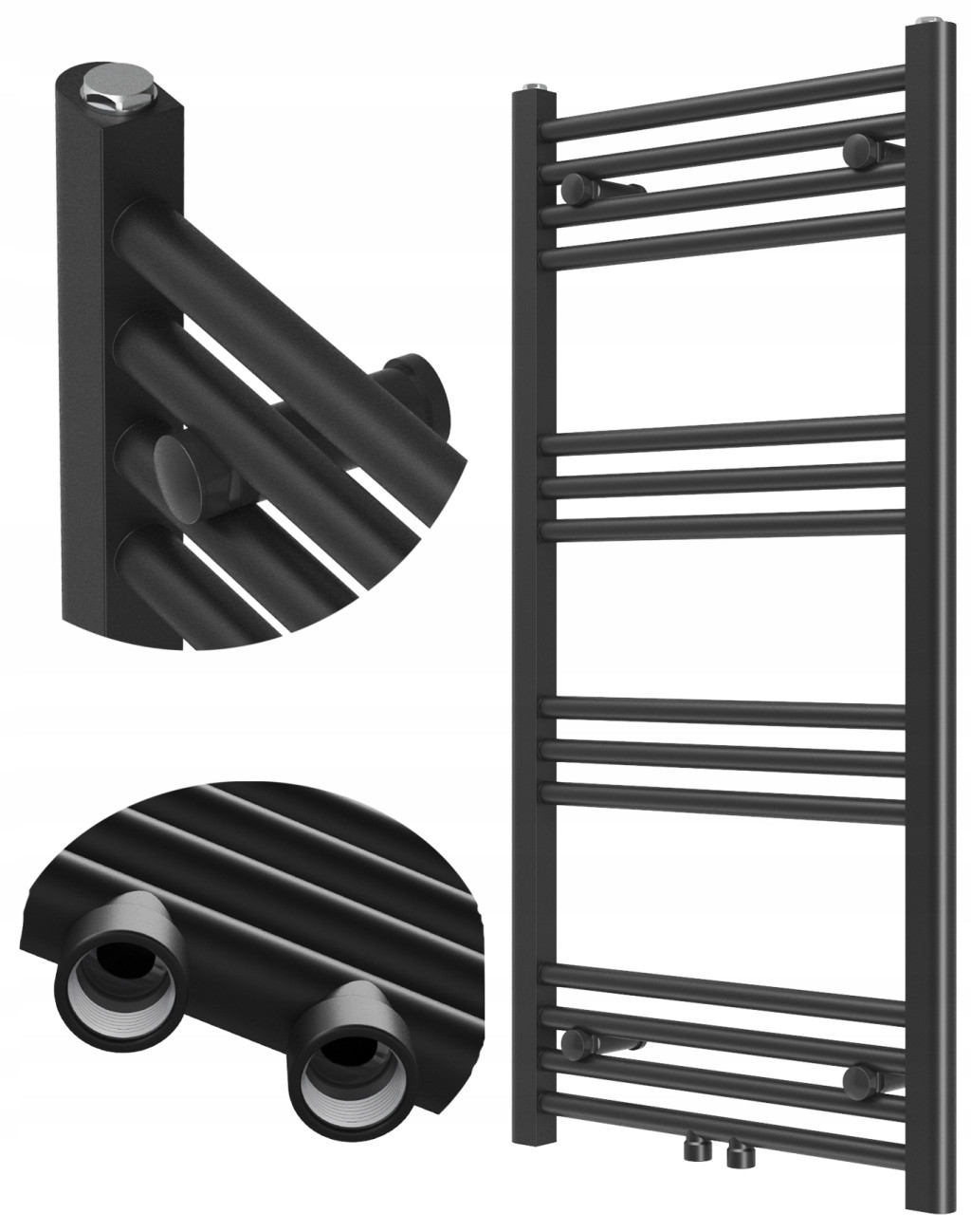 Funkcjonalny, czarny grzejnik łazienkowy w stylu drabinkowym to idealne rozwiązanie do nowoczesnych wnętrz Model Raven zapewnia wydajne ogrzewanie i trwałość na lata. Jego minimalistyczny design dodaje wnętrzu charakteru i elegancji. Grzejnik jest przystosowany zarówno do podłączenia centralnego ogrzewania, jak i opcjonalnej grzałki elektrycznej, co pozwala na jego używanie przez cały rok.