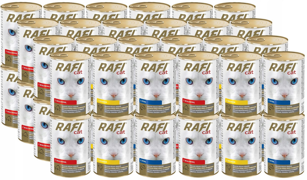 Karmy Rafi Cat to pełnoporcjowe karmy dla dorosłych kotów, które posiadają odpowiednio skomponowany skład spełniający ich wszystkie specyficzne wymagania żywieniowe. Najważniejszymi ich walorami są podstawowe surowce: mięso i produkty pochodzenia zwierzęcego oraz ryby i produkty rybne, które są źródłem wysokiej jakości białka. Karmy są produktami o optymalnej zawartości tłuszczu będącego źródłem naturalnie występującego w mięsie i produktach pochodzenia zwierzęcego kwasu arachidonowego – niezbędnego do prawidłowego funkcjonowania organizmu kotów. Dodatkowo surowce mięsne są naturalnymi źródłami kwasów z rodziny n-6, a dodatek do karm tauryny pokrywa fizjologiczną normę, dzięki czemu proces trawienia tłuszczu i białek zachodzi w sposób prawidłowy. Odpowiedni stosunek wapnia do fosforu przyczynia się do utrzymania prawidłowej homeostazy tych pierwiastków w organizmie i zachowania mineralizacji kości na stałym poziomie.