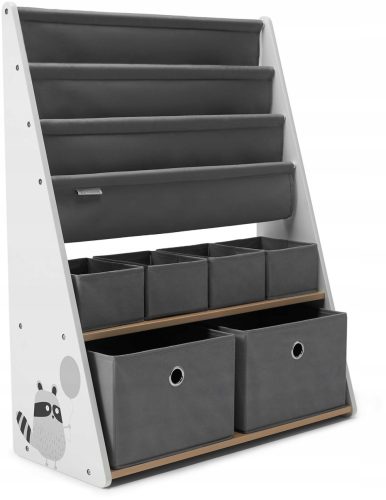 Kinderkraft Racoon to wyjątkowy mebel, który pomoże Ci zachować porządek w pokoju malucha. Racoon składa się z wytrzymałej podstawy, którą można zamocować do ściany. Dzięki temu, regał jest stabilny i bezpieczny dla każdego dziecka. Znajdujące się w zestawie materiałowe szuflady i pojemniki stanowią idealne miejsce do przechowywania zabawek, książeczek, kredek i innych cudowności, po które maluch będzie mógł saodzielnie sięgnąć. Design mebla został utrzymany w stonowanych kolorach, które przełamują pojemniki w oddziale szarości. Boczną ściankę udekorowano uroczym wzorem, który nadał mebelkowi unikalnego charakteru.