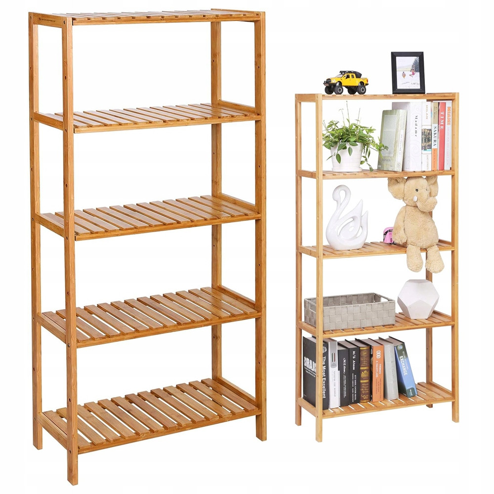 Regał z drewna bambusowego zapewnia większą stabilność i trwałość. Wszystkie metalowe elementy są nierdzewne, a powierzchnie mają gładkie wykończenie. Powłoka z lakieru dodatkowo chroni przed wilgocią.