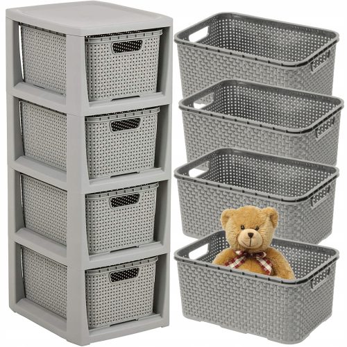 Czteroczęściowy regał .Rattan jest bardzo dobrym rozwiązaniem do przechowywania w małych przestrzeniach. Wykonany bardzo estetycznie, z wysokiej jakości, bezpiecznego materiału (wolnego od ftalanów i bpa) jest idealny do takich pomieszczeń jak łazienka, garderoba, dziecięcy pokój czy domowe biuro. Produkt polski.