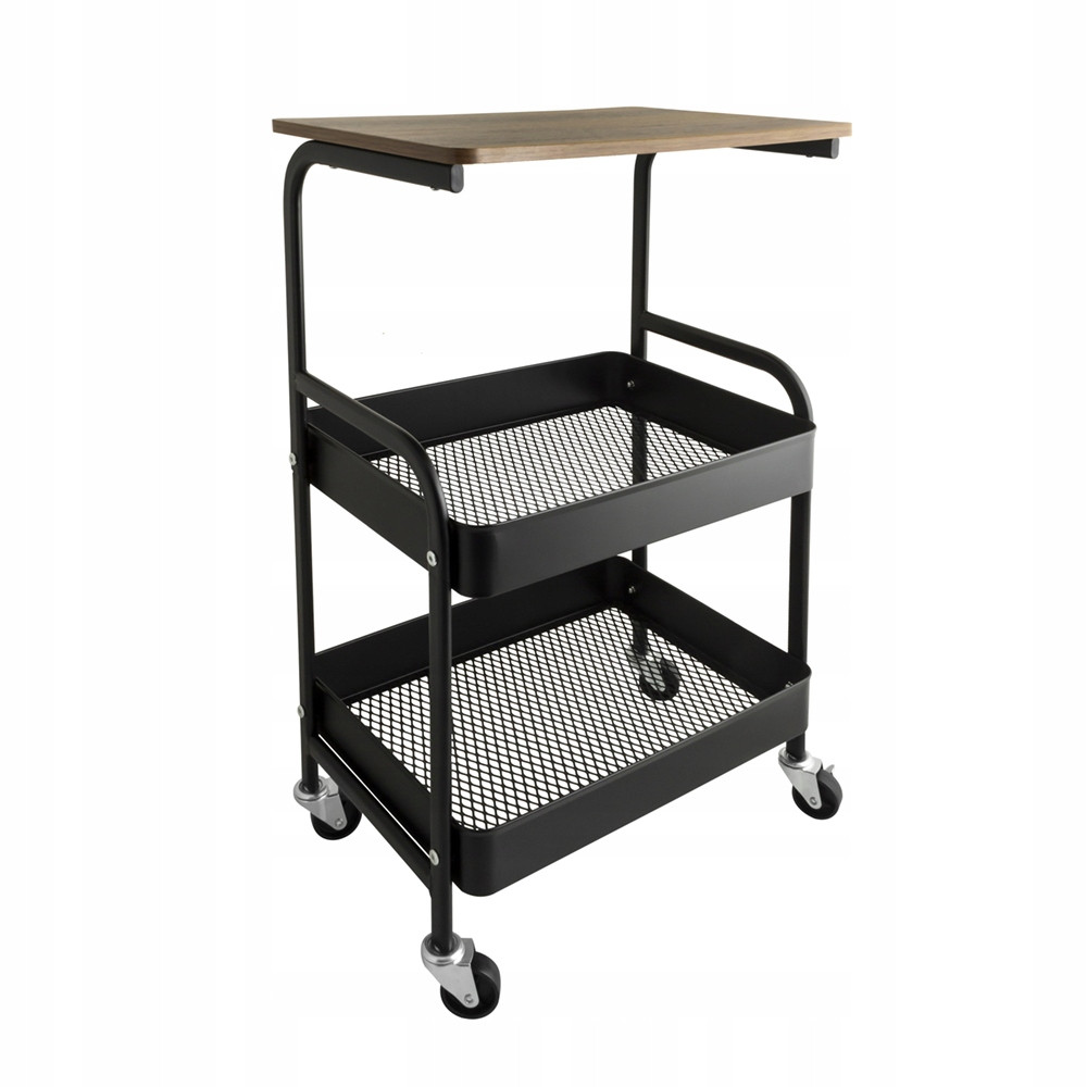 Regał na kółkach wykonany ze stali malowanej na kolor czarny. Posiada funkcjonalny blat imitujący naturalne drewno. Dodatkowo posiada dwa kosze z ażurowym spodem. Kółka zapewniają mobilność, ale zostały także wyposażone w blokady. Regał wymaga samodzielnego skręcenia.
