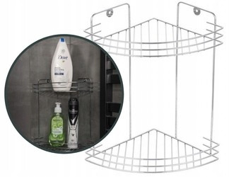 Półka łazienkowa 2-poziomowa narożna. Posiada 2 półki, które ułatwiają porządkowanie produktów. Praktyczne półki pozwalają pomieścić dużą ilość akcesoriów łazienkowych. Bez problemu można wszystko posegregować, aby mieć je pod ręką. Do ściany mocowana jest za pomocą dwóch śrub wkręcanych w kołki rozporowe. Śruby wkręcane są w specjalnie do tego celu przymocowane uchwyty w górnej części półki. Zarówno śruby jak i kołki rozporowe są dołączone do produktu.