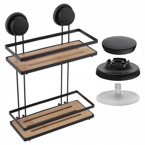 Półka łazienkowa wykonana z wysokiej jakości stali malowanej proszkowo na kolor czarny. Elementy dekoracyjne z drewna bambusowego. Półka jest wyposażona w dwa kosze mocowane do ściany na silną przyssawkę.