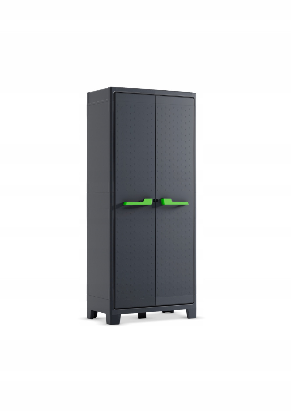 Wysoka szafa Moby wykonana została z wysokiej jakości tworzywa sztucznego. Materiał ten cechuje się niebywałą wytrzymałością i odpornością na niekorzystny wpływ czynników atmosferycznych, dzięki czemu szafa może zostać umieszczona również na zewnątrz. Wewnątrz wysokiej szafy Moby znajdują się cztery praktyczne półki o ładowności do 30 kg każda, których wysokość można bez problemu dostosować do własnych potrzeb. Wysoka szafa Moby wyposażona została także w ergonomiczne i niezwykle poręczne uchwyty, regulowane nóżki oraz specjalne otwory umożliwiające zamykanie jej na kłódkę, co dodatkowo zwiększa bezpieczeństwo przechowywanych w niej przedmiotów. Całkowite obciążenie szafy wynosi aż 150 kg.