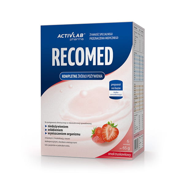 Żywność specjalnego przeznaczenia medycznego. Kompletne źródło pożywienia o składzie uwzględniającym zapotrzebowanie organizmu do odżywiania osób w okresie rekonwalescencji po chorobie, operacji, niedożywionych, wyniszczonych. RecoMed zawiera wszystkie niezbędne składniki odżywcze: białko, węglowodany, tłuszcz, błonnik pokarmowy oraz komplet witamin i składników mineralnych. Skoncentrowana forma produktu ułatwia podawanie i nie obciąża dodatkowo organizmu chorego. Białko obecne w produkcie to najwyższej jakości koncentrat białka serwatkowego (WPC) o wartości biologicznej BV 104. Skład aminokwasowy białka został ponadto zoptymalizowany przez dodanie aminokwasów w proporcjach niezbędnych do zwiększenia wartości odżywczej białka – uzyskania optymalnych proporcji aminokwasów egzogennych (EAA) zalecanych w dziennym spożyciu przez Światową Organizację Zdrowia (WHO).