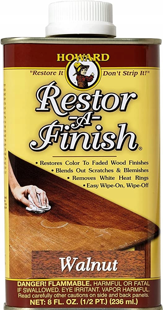 Najpierw przetestuj Restor-A-Finish na małej niewidocznej powierzchni, aby sprawdzić uzyskany kolor, penetrację w głąb wykończenia i czy należy użyć bardzo drobnej wełny stalowej lub miękkiej szmatki. Należy chronić tkaniny, dywany lub linoleum podczas nakładania Restor-A-Finish, ponieważ może on pozostawić trwałe plamy. Jeśli dojdzie do rozlania, należy natychmiast wyszorować miejsce wodą z mydłem lub odplamiaczem i wytrzeć do sucha.