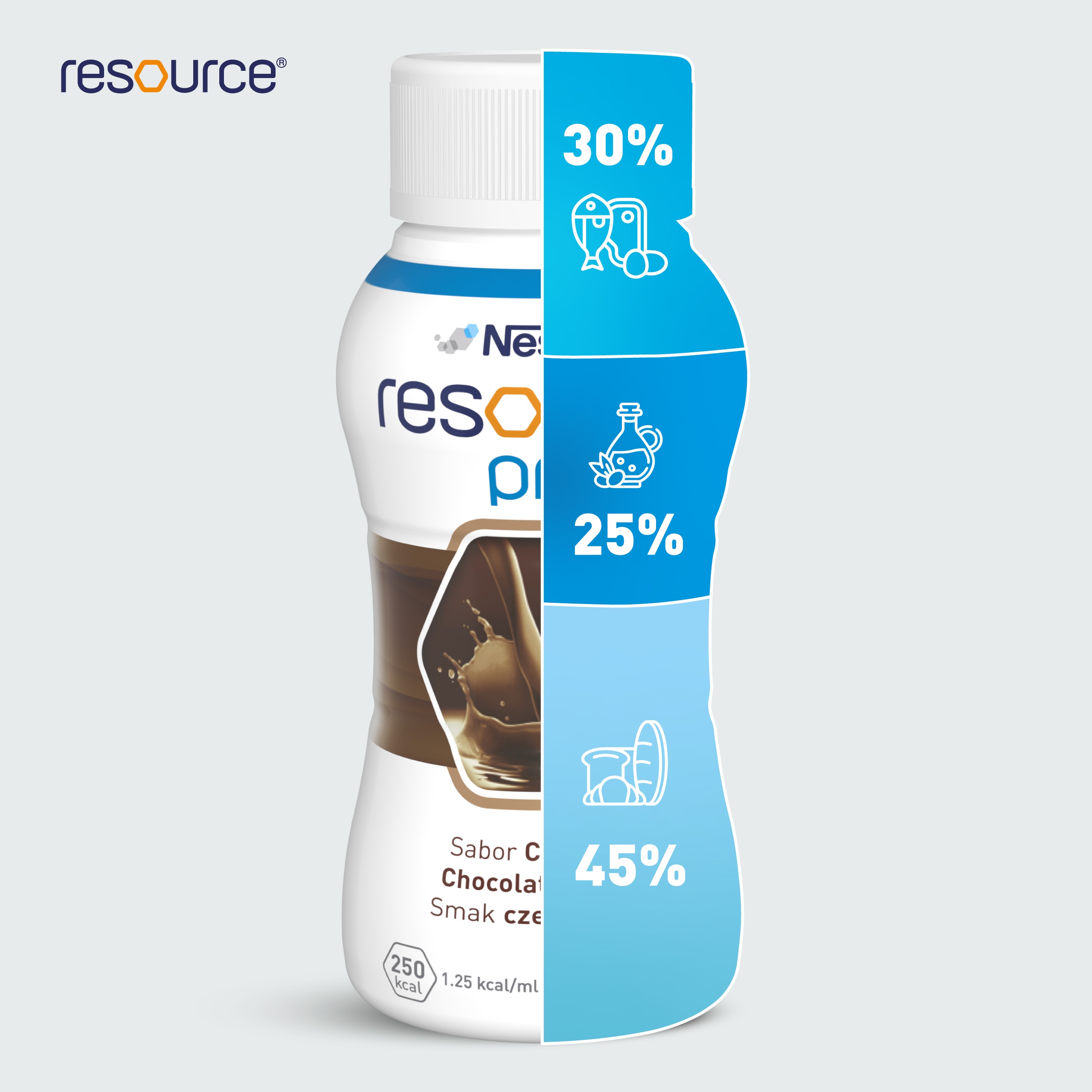 Odkryj specjalistyczny preparat odżywczy Resource Protein smak czekoladowy, który jest kompletną pod względem odżywczym, wysokobiałkową dietą w płynie.