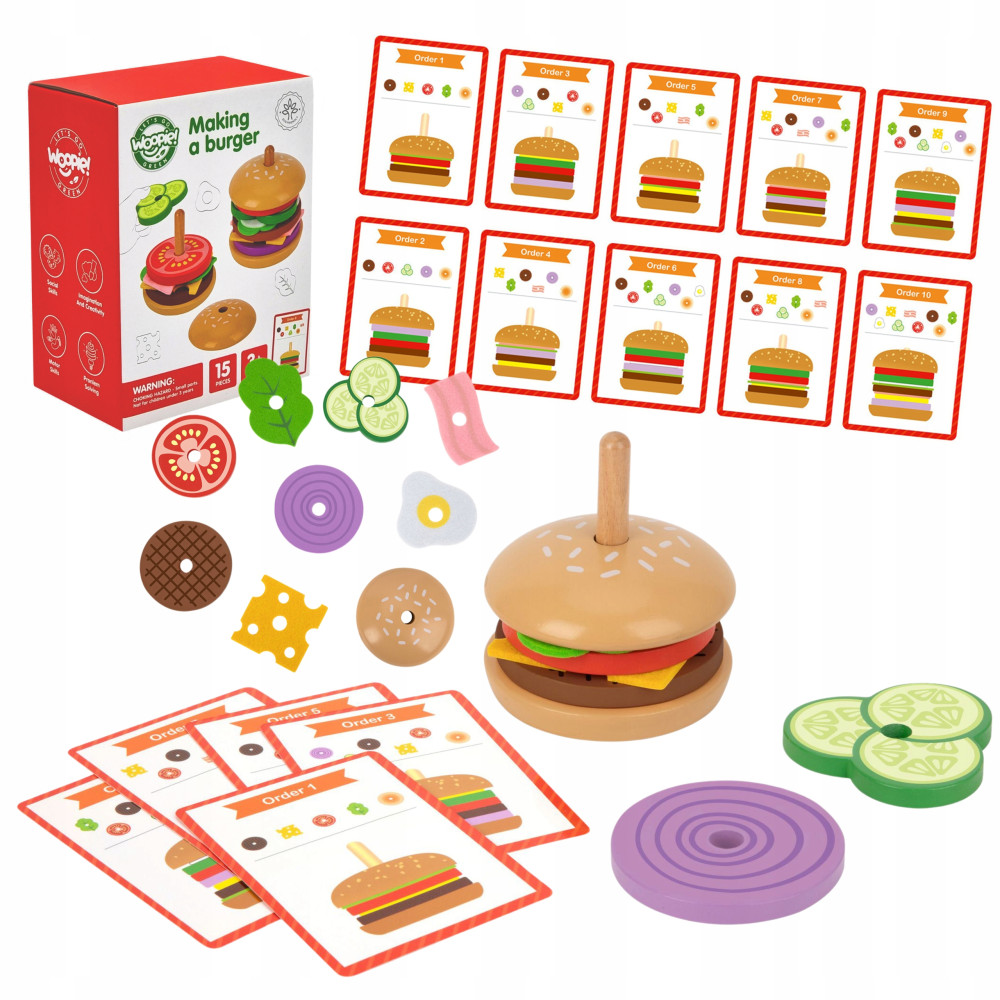 Drewniany Burger od marki WOOPIE z serii GREEN to ciekawa edukacyjna zabawka dla wszystkich dzieci. Zestaw zawiera 15 el.: w tym 2 bułki burgera, 8 składników burgera i 5 kart z 10 wzorami burgera. Zabawka polega na ułożeniu burgera zgodnie ze wzorem. Na każdej karcie ze wzorem burgera, na górze są pokazane składniki, a na dole pokazany wygląd burgera z boku. Dziecko wybiera potrzebne składniki, a następnie patrząc na grubość i kolor układa składniki zgodnie z kolejnością. Zabawę można urozmaicić o grę w zapamiętywanie i odtwarzanie z pamięci obrazka przez malucha. Można również zakryć na karcie składniki, a dziecko na podstawie samego wyglądu może dobrać potrzebne składniki i ułożyć hamburgera. Dziecko może również wymyślić swój własny wygląd burgera - ogranicza tylko kreatywność i wyobraźnia. Dodatkowo dziecko podczas zabawy może wcielić się w prawdziwego kucharza (odgrywanie ról). Zabawka rozwija zdolności manualne, logiczne myślenie, wyobraźnie i kreatywność, koncentracje oraz zapamiętywanie.