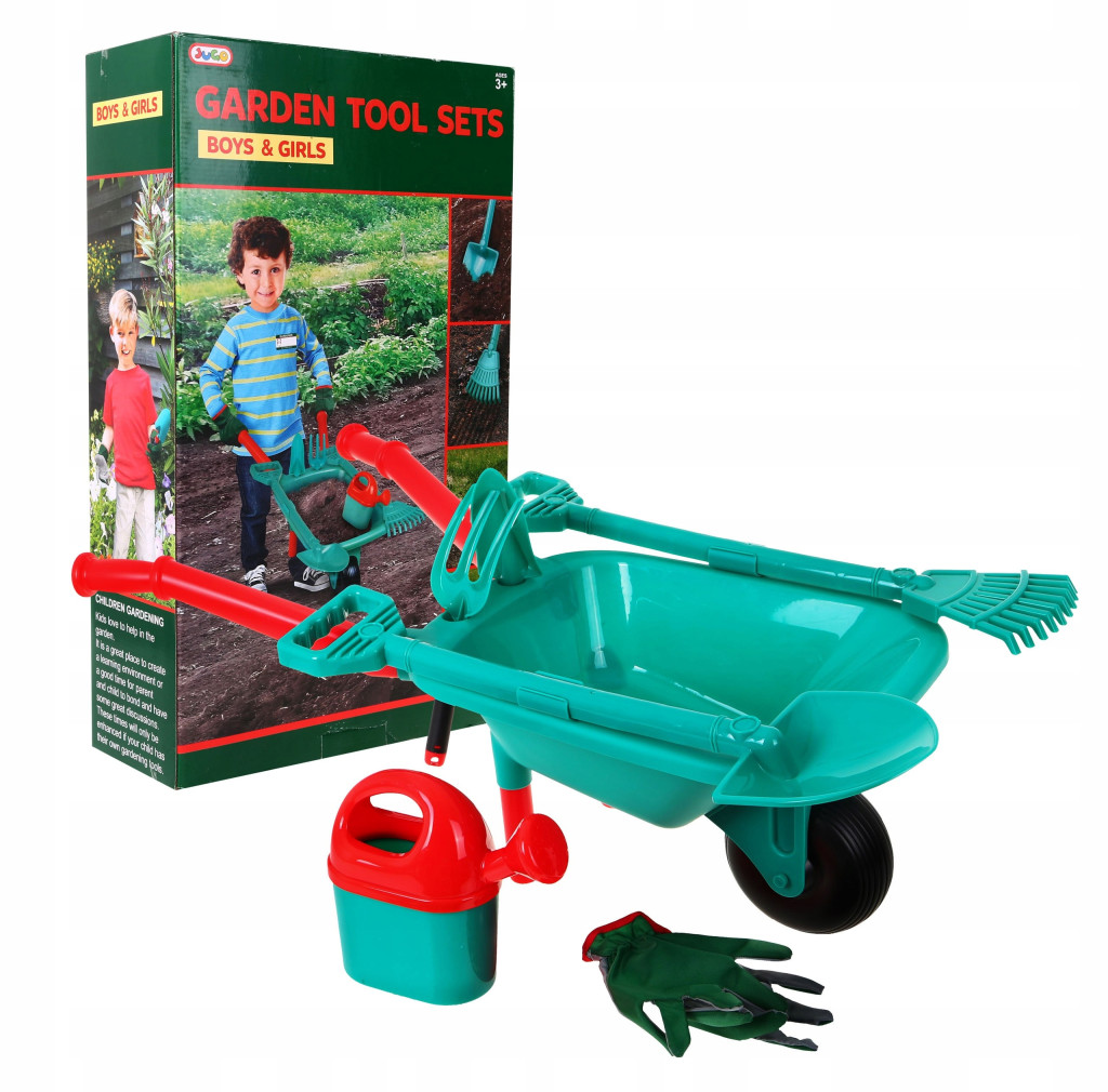 Taczki posiadają otwory, w których można umieścić widełki i łopatkę, a po boku na zaczepach można ułożyć duże grabki i łopatę. Zestaw zawiera także rękawiczki, żeby młody ogrodnik nie skaleczył się lub ubrudził.