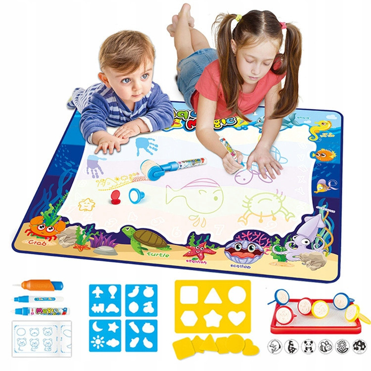 Magiczna mata wodna do malowania to świetna zabawa da dzieci, która nigdy się nie kończy ! Nasz zestaw zapewni rozrywkę maluchom na długie godziny. Do malowania na naszej magicznej macie wystarczy czysta woda, nie musisz więc obawiać się żadnych plam po pisakach, farbach itp.