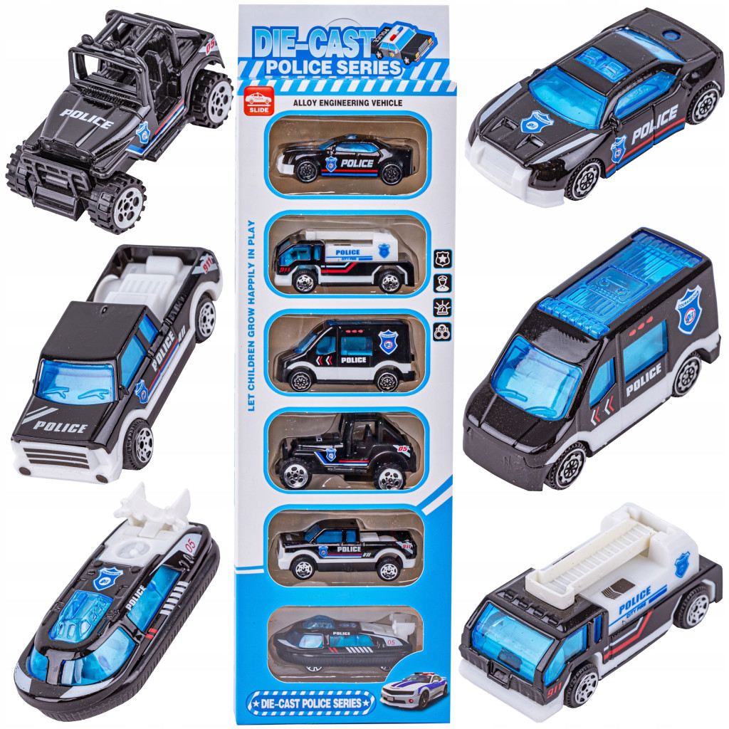 Zestaw zawiera różnorodne pojazdy, każdy z nich to unikalna maszyna policyjna. W zestawie znajdziesz: