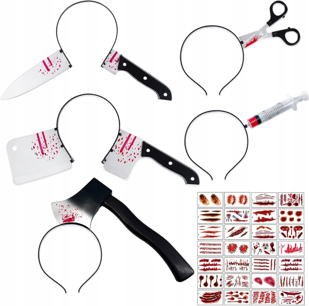✅ Nasz zestaw na Halloween zawiera pięć makabrycznych nakładek na głowę: ostrze wbite w głowę, nożyczki przekłute przez głowę, strzykawkę wbijającą się w głowę, krwawą siekierę i nóż rzeźniczy. Dodatkowo, zestaw zawiera 30 tymczasowych tatuaży do ciała, które zwiększają realizm całej stylizacji.