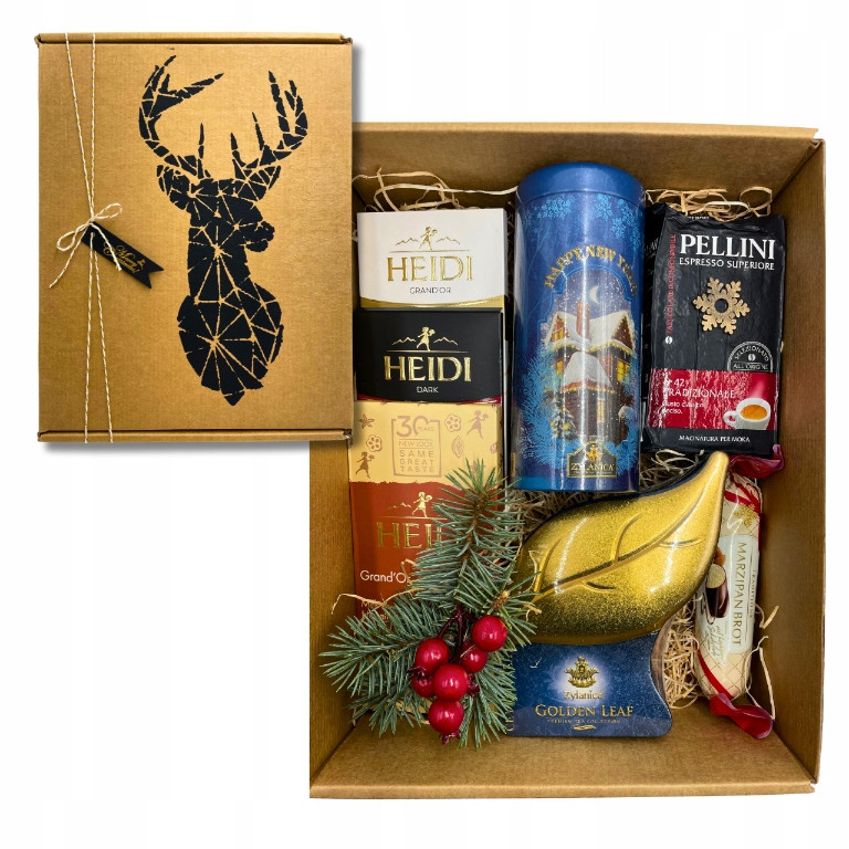 Elegancko zapakowany w artystyczne opakowanie z motywem jelenia, ten zestaw łączy w sobie smak, jakość i styl, wprowadzając odrobinę luksusu do każdej świątecznej chwili.