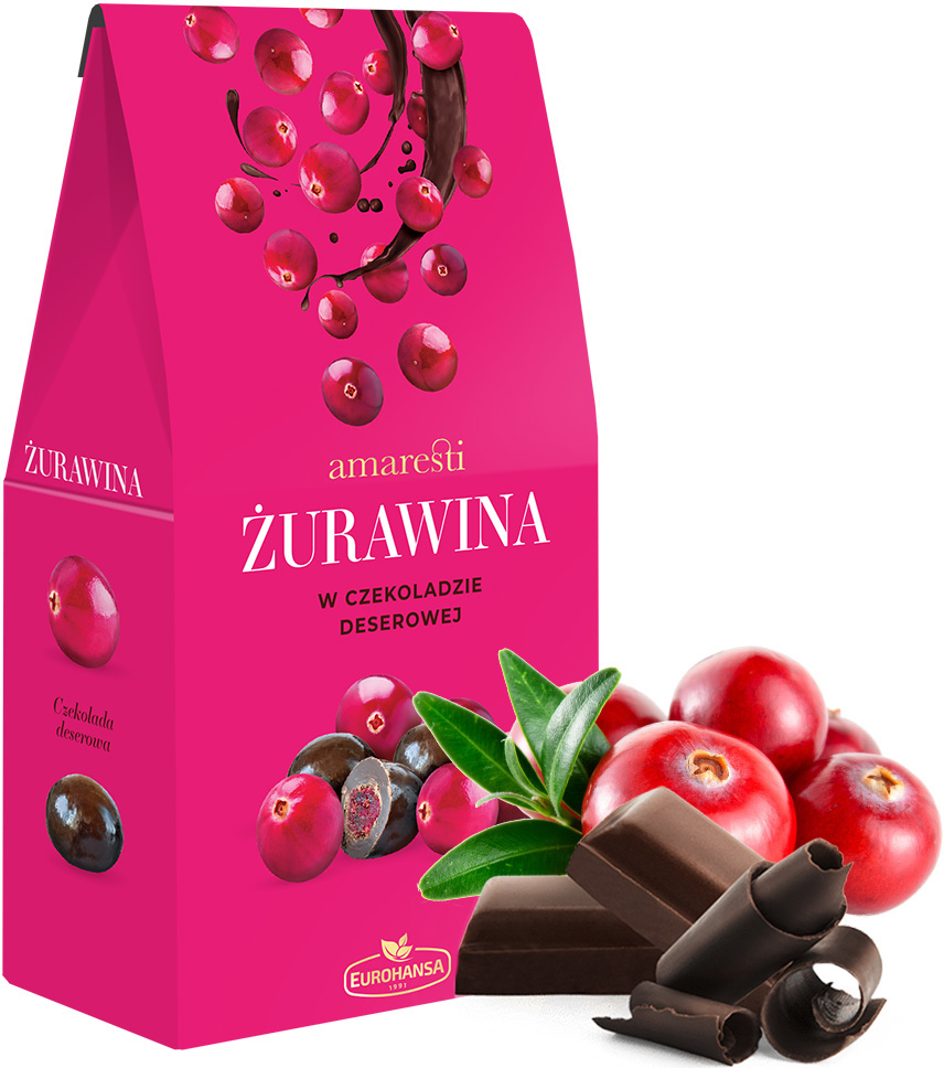 Żurawina to owoc charakteryzujący się specyficznym smakiem i aromatem od lat wykorzystywany w medycynie naturalnej. Bogactwo witamin oraz wartości odżywczych gwarantuje, że żurawina to smaczna i zdrowa przekąska. Otulona delikatną słodyczą czekolady deserowej jest idealnym przysmakiem w ciągu dnia, dla każdego kto ceni sobie zdrowie w połączeniu z przyjemnością.