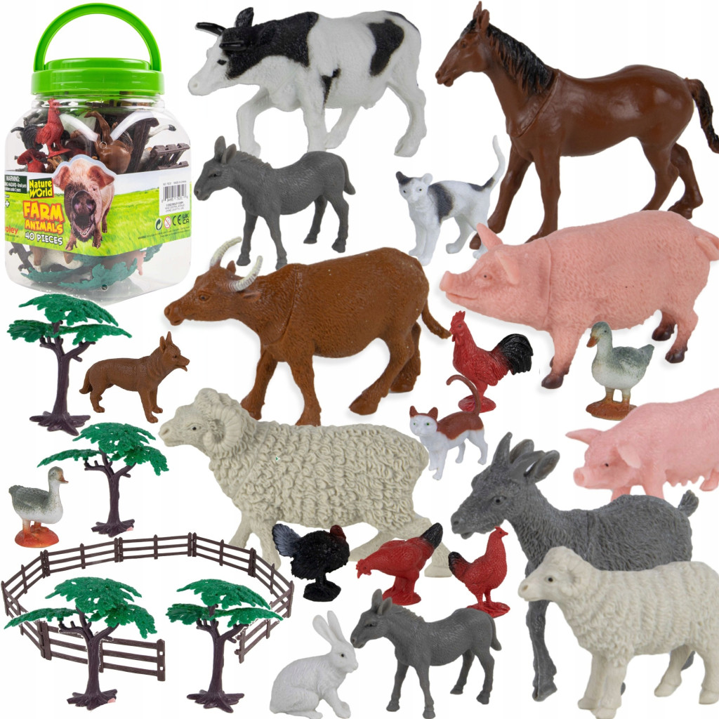 Figurki zwierzątek wykonane są bardzo szczegółowe z materiałów wysokiej jakości, wyglądają niezwykle realistyczne i mają wiernie odwzorowane detale. Figurki przedstawiają zwierzęta na farmie - świnki, koguty, krowy, kury, owieczki, konie, psy, koty i inne. Dla jeszcze ciekawszej zabawy do zestawu są dołączone drzewka i ogrodzenia w brązowym kolorze.