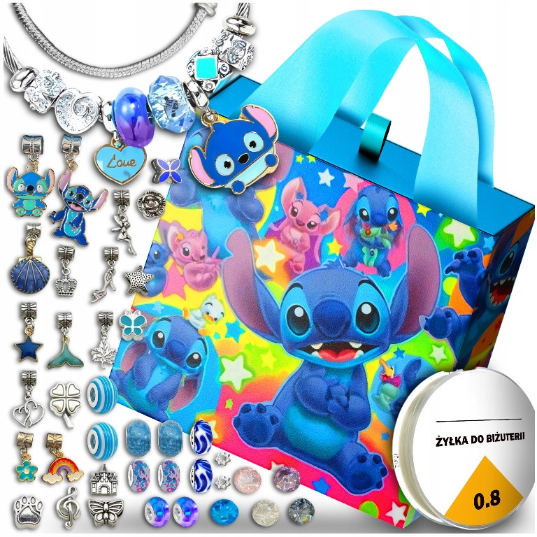 Idealny prezent dla fanów Stitch! Kreatywny zestaw do robienia biżuterii pozwala na tworzenie unikalnych bransoletek i naszyjników z motywem ulubionego bohatera.