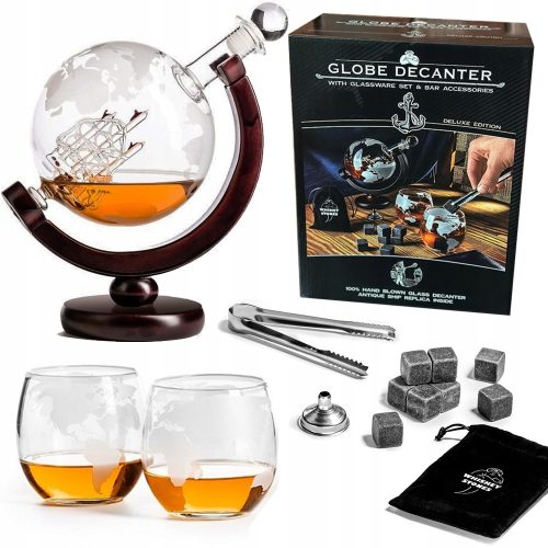 Kultowy już zestaw do whisky globus z ręcznie wykonaną karafką globus z żaglowcem w środku, na której wygrawerowana jest mapa świata oraz grawerowanymi szklankami. Nasz zestaw uzupełniliśmy ocenione przez koneserów trunków kamienne kości umieszczone w przyjemnym dla oka i w dotyku welurowym woreczku, zgrabne szczypce do umieszczania kamiennych kości oraz praktyczny metalowy lejek, by wygodniej i bez strat uzupełniać zawartość naszej wyjątkowej karafki. Żaglowce co prawda nie lubią, gdy brakuje im przynajmniej stopy wody (whiskey? ;) ) pod kilem, ale tak przyjemnie jest, gdy w karafce trunku coraz mniej, a Ty żeglujesz już po bezkresnych morzach i lekko falujesz wsłuchany w w morski szum. Ahoj przygodo, wyruszajcie w rejs ze szklanką schłodzonego przez kamienne kości trunku w dłoni!