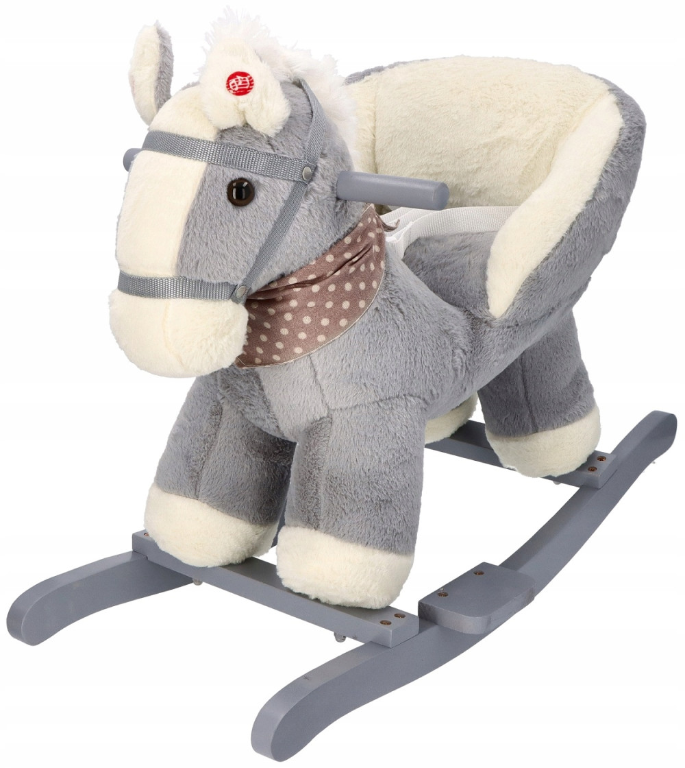 Konik wykonany jest z mięciutkiego i delikatnego w dotyku pluszowego materiału w delikatnym szarym kolorze. Płozy i uchwyty na rączki wykonano z drewna w odcieniu szarości idealnie komponują się z całością. Białe kopytka, białe wnętrze fotelika, chustka na szyi w urocze groszki, sprawiają, że trudno mu się oprzeć.