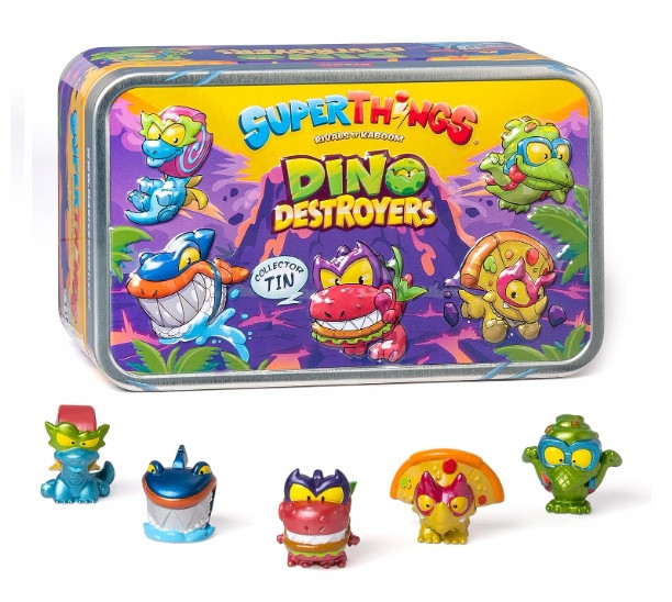 Dino Destroyers to wyjątkowa ekipa Super Things, która powstała na skutek inspiracji prehistorycznymi potworami, które przemierzały tereny, siejąc spustoszenie wśród wszystkich mniejszych osobników. Metalowa puszka skrywa 5 ekskluzywnych figurek, przedstawiających kolejno Diplodoofusa, Megalobomba, T-Bite’a, Chocodactyla i Triceratttacka – każdy z nich wygląda jak dinozaur, tyle że ma nieco odmienny kolor skóry czy charakterystyczne elementy wyglądu, które dodają komizmu i sprawiają, że figurki inspirują do dalszej zabawy. Co ważne, cała ekipa bohaterów Dino Destroyers należy do superzłoczyńców, dlatego warto mieć się na baczności, szczególnie że te groźne bestie potrafią wyrządzić wiele szkód!
