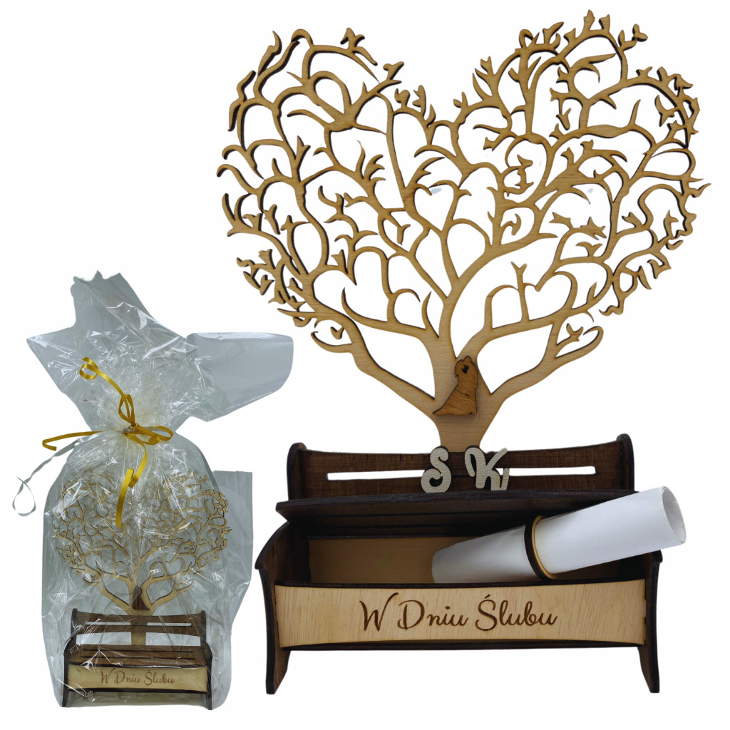 Drewniana pamiątka przedstawiająca drzewo w kształcie serca z otwieraną ławeczką to bardzo oryginalny pomysł na prezent dla Młodej Pary. Pamiątka posłuży jako piękna dekoracja na długie lata, zamiast trafić do szuflady ze stertą standardowych kartek z życzeniami :) Ławeczka jest otwierana, w środku znajduje się kartka z życzeniami zabezpieczona drewnianą obrączką - do środka bez problemu zmieści się również gotówka.