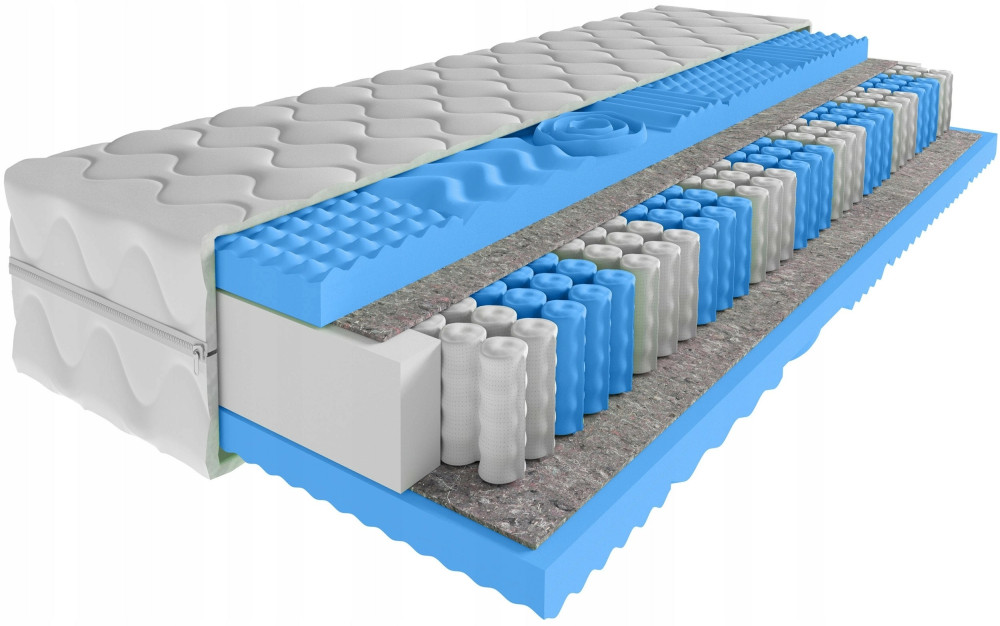 Materac wykonany na bazie sprężyn kieszeniowych, które połączone są ze sobą za pomocą specjalnych kieszonek w system, który sprawia, że każda jego część pracuje niezależnie od pozostałych, zapewniając elastyczność punktową materaca.