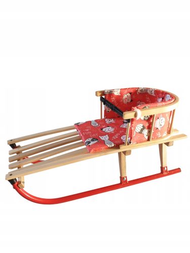 Sanki z oparciem, cieplutkim materacem, sznurkiem z drewnianą rączką i pasami bezpieczeństwa. Oparcie i materacyk można zdemontować.