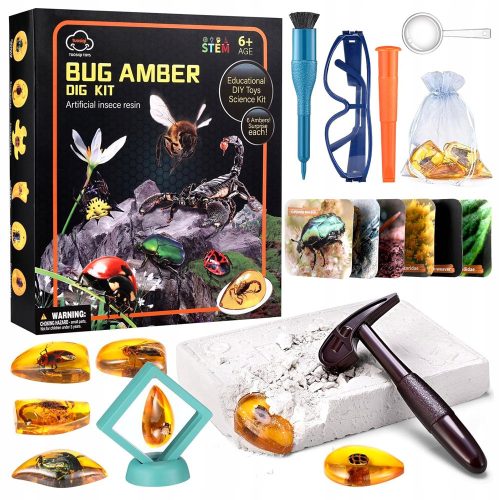 W gipsowym odlewie zostało ukrytych sześć bursztynów z zatopionymi owadami. Naszym zadaniem jest wykopanie ich za pomocą dołączonych przyrządów- młoteczka i dłuta. Jest to mozolna, ale bardzo satysfakcjonująca praca. Odnalezione bursztyny można umieścić w ozdobnym woreczku lub stojaku do prezentacji, dzięki czemu będą intersującą ozdobą każdego dziecięcego pokoju.