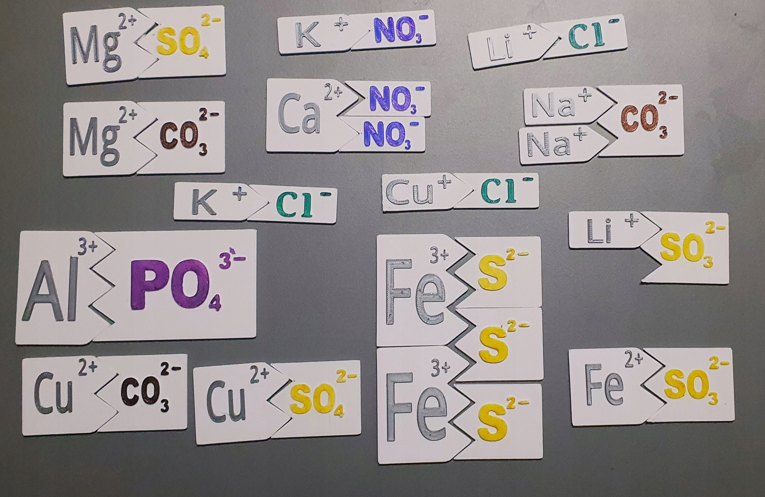 Zestaw 33 puzzli do tworzenia cząsteczek soli i modelowania procesu ich dysocjacji jonowej. Każdy element symbolizuje jon (anion lub kation), a wartość jonu przedstawiona jest za pomocą ząbków lub wcięć. Dzięki przemyślanej konstrukcji, uczniowie mogą dowolnie łączyć kationy metali z anionami reszt kwasowych, tworząc wiele różnych cząsteczek soli.