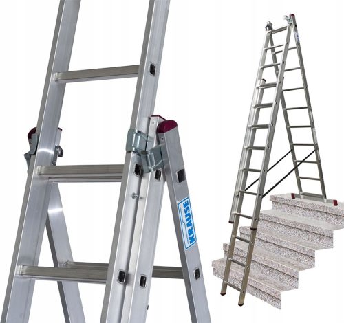 Trzyelementowa drabina aluminiowa do wrzechstronnych zastosowań jako: drabina przystawna, rozsuwana, rozstawiana jako drabina wolnostojąca.