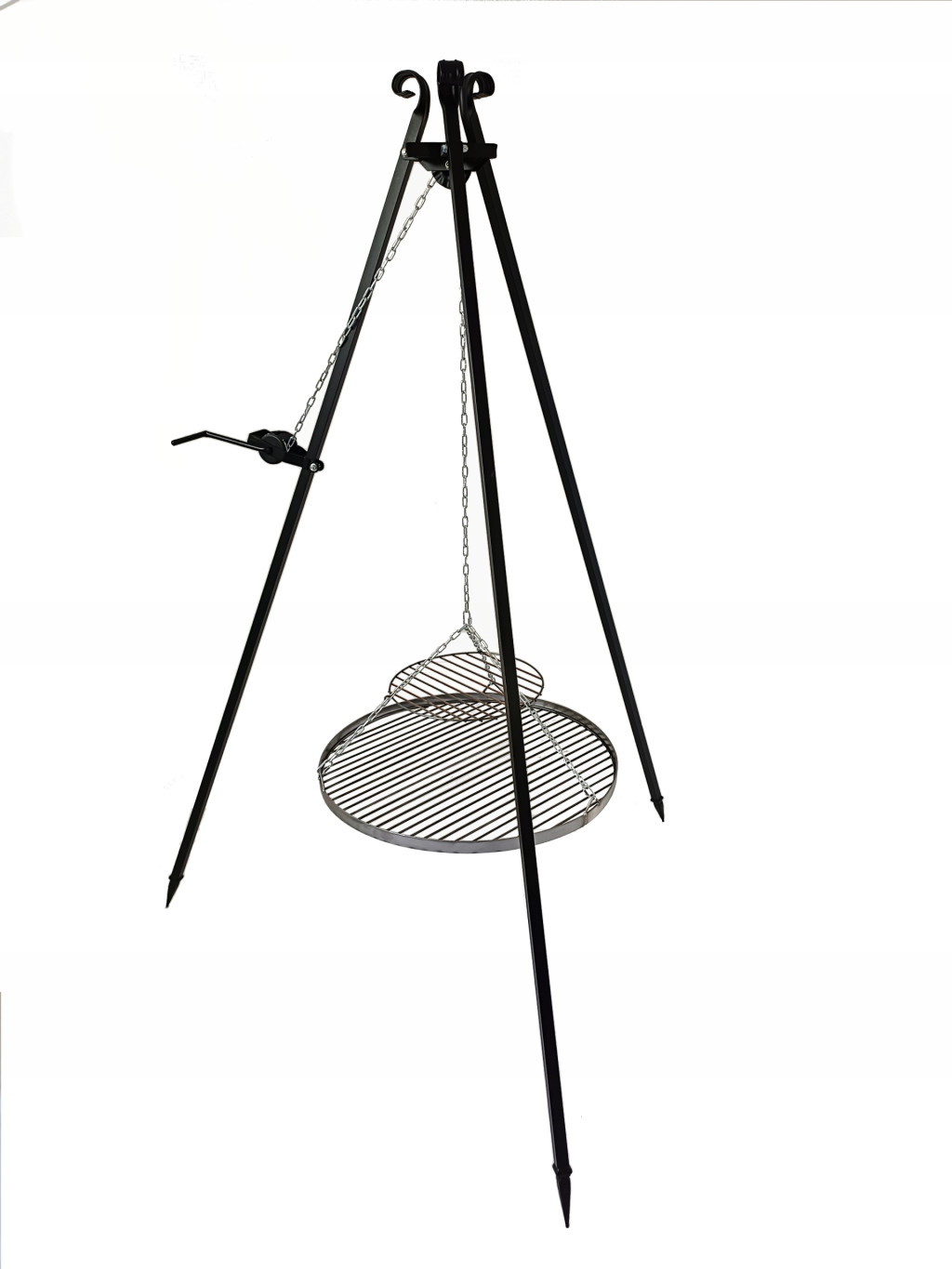 Grill kuty na ozdobnym trójnogu o wysokości 180 cm z wiszącym, odpinanym rusztem o średnicy 70 cm